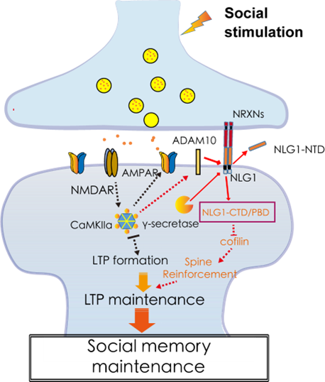 研究团队发现:1、动物社交活动可以激活腹侧海马区的ADAM10(α-分泌酶)。该蛋白酶可切割上百种跨膜蛋白,包括Neuroligins、Neurexins、Cadherins等谷氨酸能跨膜蛋白,这些蛋白可进一步被γ-分泌酶剪切,产生游离胞内段蛋白。如果抑制ADAM10活性,可阻断社交记忆形成,提示活性刺激后的ADAM10活化、蛋白剪切(突触结构重塑)对于新记忆形成是必需的。2、ADAM10剪切底物NLG1缺失会导致社交记忆维持受损,补充γ-分泌酶剪切产物NLG1-CTD(含PBD结构域),可以挽救上述缺陷。3、利用跨膜多肽Tat-PBD可挽救缺陷小鼠的社交记忆、新物体识别记忆、空间记忆等多种记忆范式的维持缺陷。