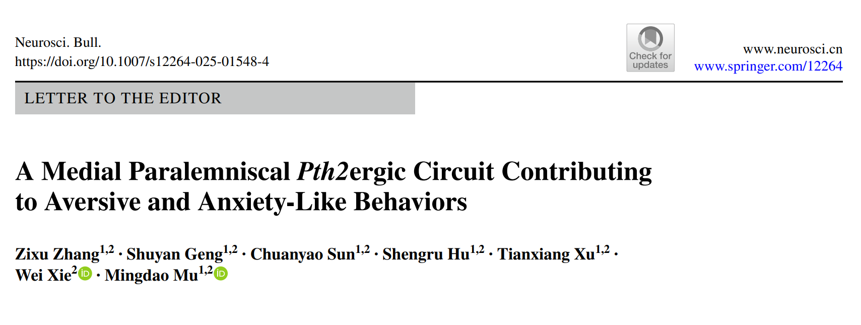 近日,“发育与疾病相关基因”教育部重点实验室谢维/穆明道团队合作,首次揭示了一条起源于脑干内侧丘系旁核(MPL)、由表达Pth2神经肽的神经元构成的全新神经环路,该环路在编码厌恶性刺激和触发焦虑样行为中起关键作用。该成果于近期在中国神经科学会会刊《Neuroscience Bulletin》上在线发表。